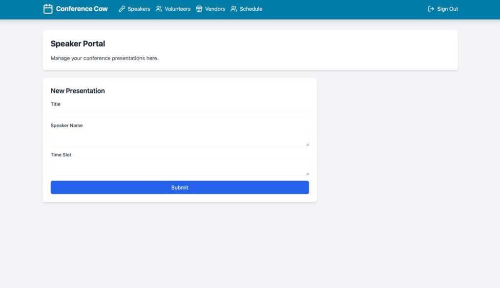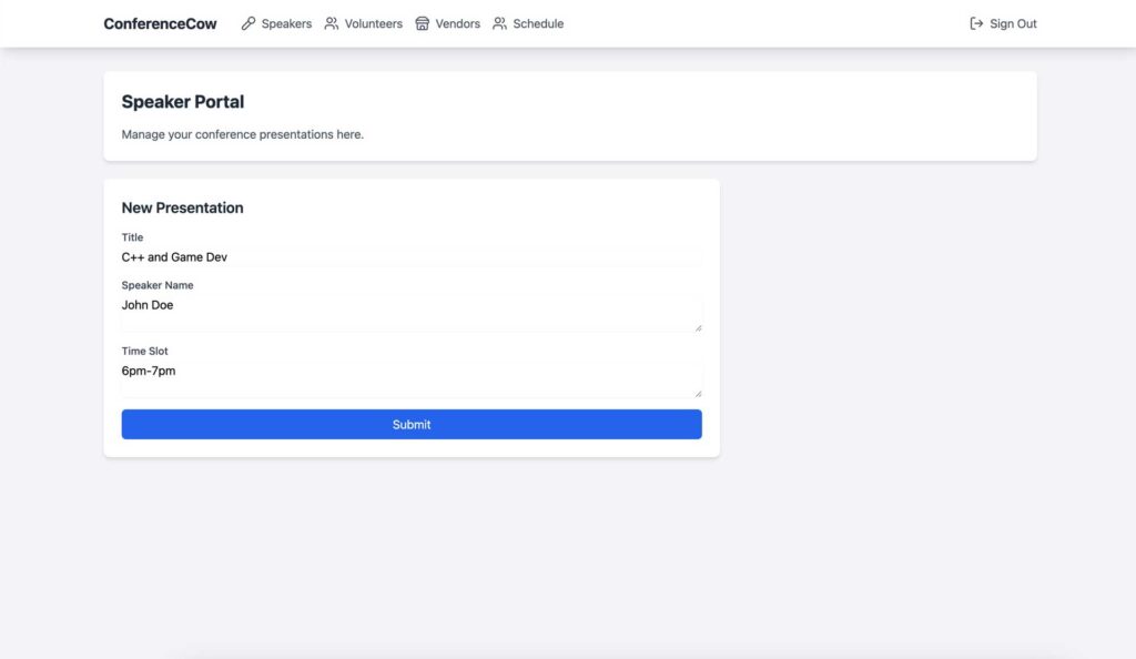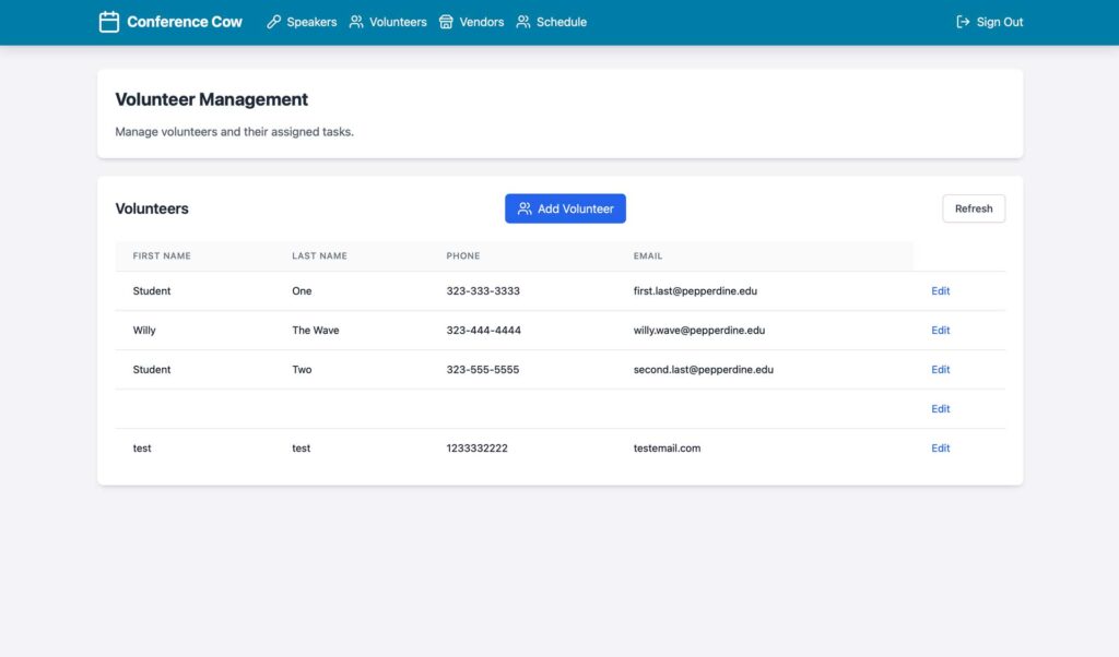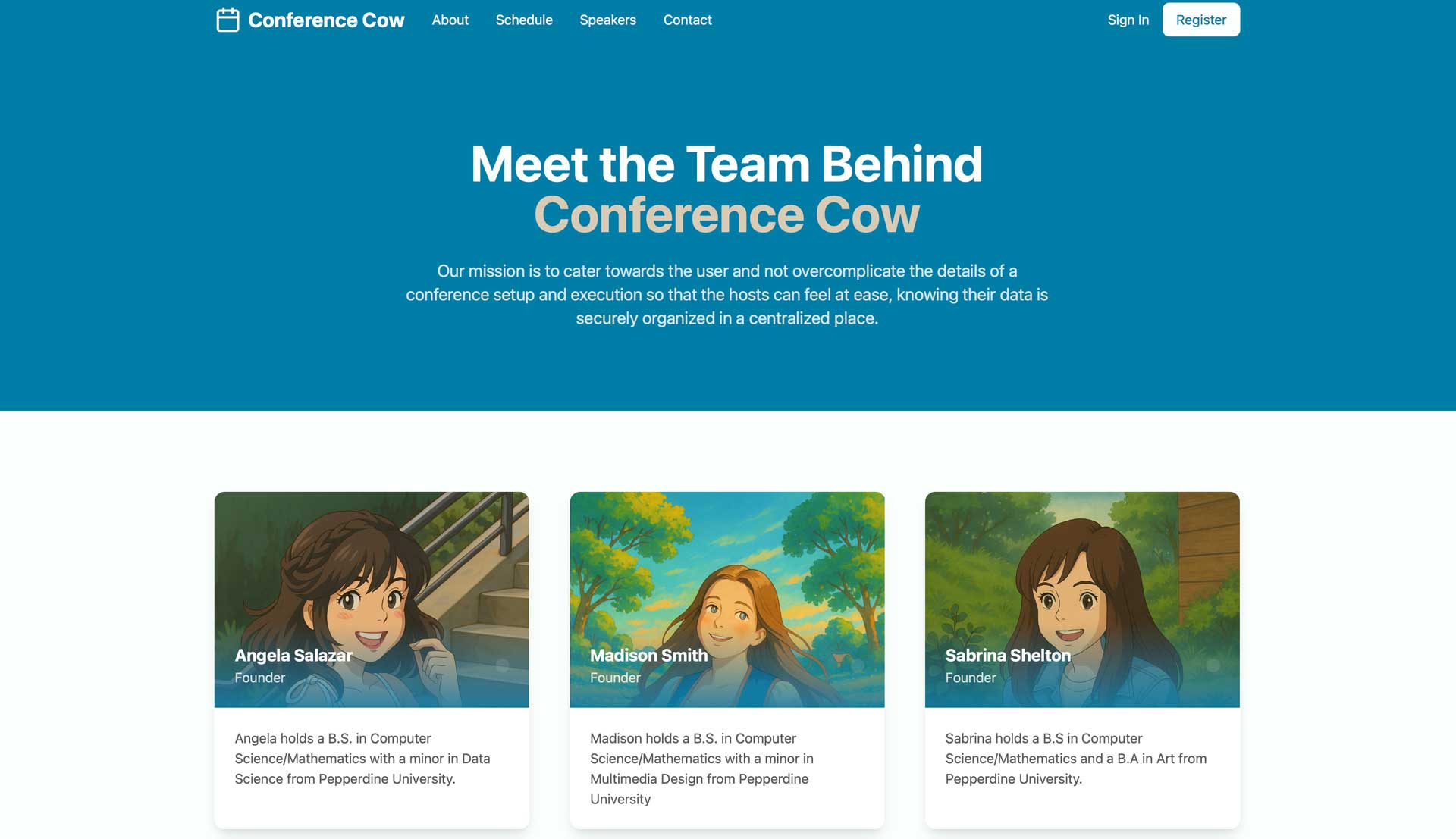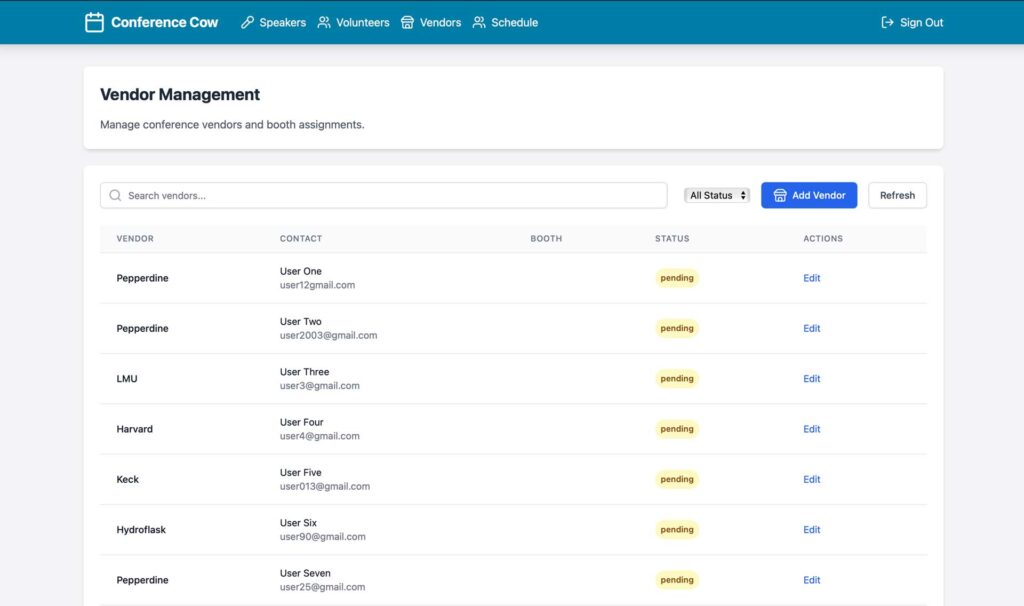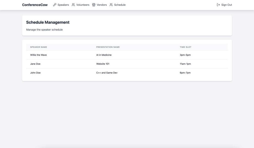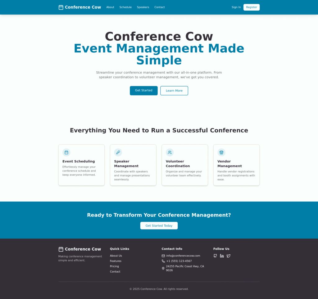 Conference Cow (2025) is a full-stack web application designed to simplify and centralize academic conference planning. The idea emerged from a gap in Pepperdine University’s internal tools for managing multi-day academic events. Developed under faculty mentorship, the platform streamlines tasks like speaker tracking, scheduling, and resource coordination. I served as the technical lead, overseeing front-end development and contributing to backend integration using a Supabase-based architecture. I also coordinated a small engineering team through weekly standups, version control workflows, and iterative debugging. The platform is being integrated for active use by Pepperdine faculty to manage their conference infrastructure.
